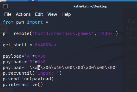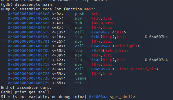 이전에 확인했던 코드들을 봤을때 scanf()라는 취약한 함수를 사용하고 있었고 void get_shell()로 cmd창을 불러오는 이름바 interactive()느낌의 코드함수도 존재했ㄷ. 즉, buf[0x28]에 해당하는 장소에 scanf를 통해 입력값을 넣은 뒤 오버플로우를 시켜서 return address 장소에 해당 get_shell()함수의 주소를 불러와 실행하게 해야한다. init()함수는 단순한 초기화 함수로 필요가 없다. 그렇기 때문에 위에 사진에서 보면 알다싶이 get_shell 주소를 찾았다. 지금 다시 위 코드를 보면 rsp를 0x30만큼 늘리고 sef는 0x8만큼의 크기를 가진다.