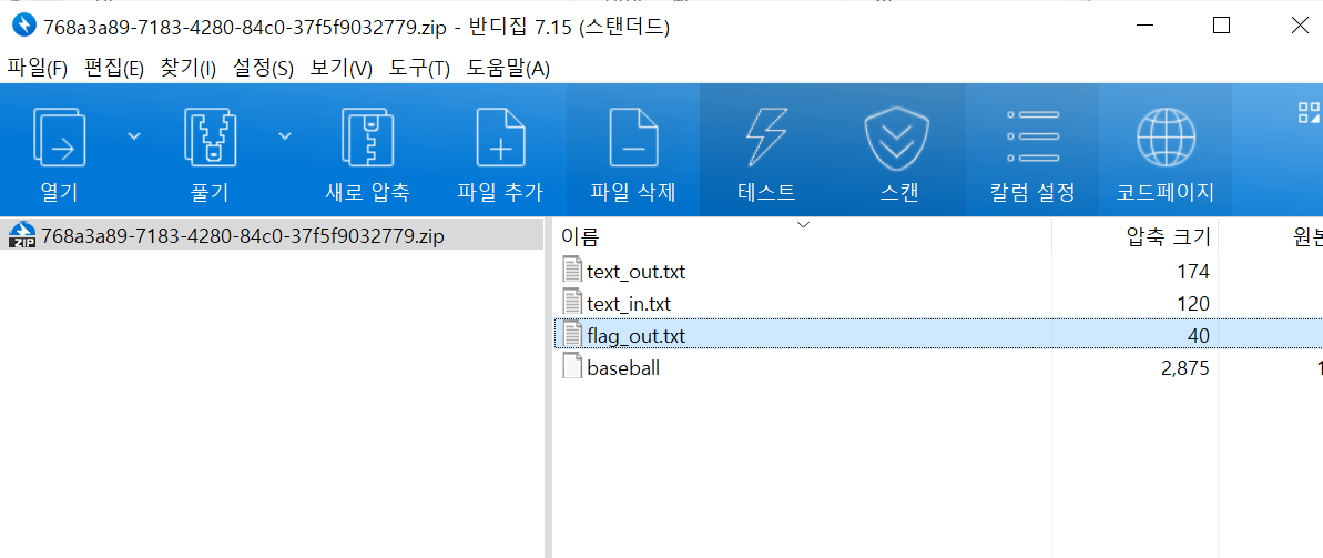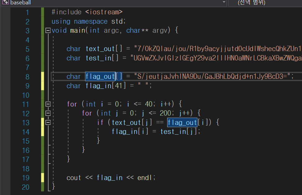 여기를 보면 text_in를 집어넣어서 아래 baseball 프로그램을 통해 걸쳐 나온 결과가 text_out으로 나온것같다. 입력값, 결과값을 알려줘서 특정 무언가를 구하게 한뒤 flag 결과값을 보여줬기에 그거를 반대로 돌려 계산하여 원래 flag 입력값을 찾아내는 식의 문제같았다.
