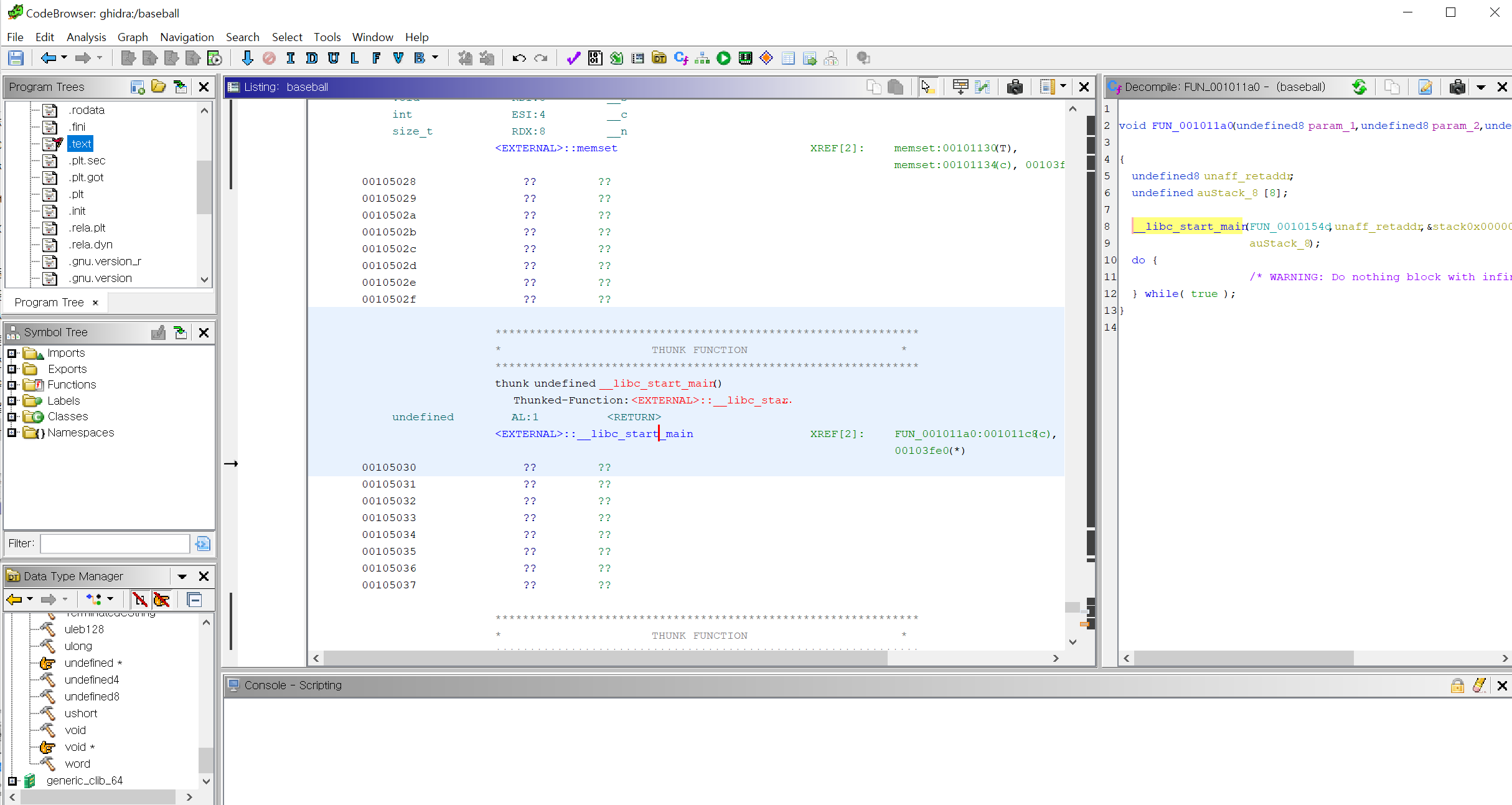 두번째로 실행한 방법은 다른 tool을 사용하는 것이었다. 이툴은 리눅스 elf 파일을 불러와서 코드로도 보여주는 도구이다. 해당 툴로 열어본결과