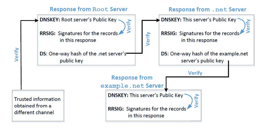▪ DNSSEC와 TLS/SSL은 모두 공개 키 기술을 기반으로 하지만 신뢰 체인이 다릅니다. – DNSSEC는 DNS 영역 계층을 사용하여 신뢰 체인을 제공하므로 상위 영역의 네임서버는 하위 영역의 네임서버를 보증합니다. – TLS/SSL은 다른 컴퓨터를 보증하는 CA(인증 기관)가 포함된 PKI(공개 키 인프라)에 의존합니다.