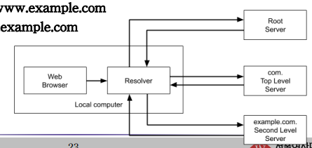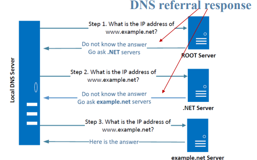 ▪ 반복 프로세스는 ROOT 서버에서 시작됩니다. IP 주소를 모르면 다음 레벨 서버(.NET 서버)의 네임서버 IP 주소를 되돌려주고, 그 다음 답을 제공하는 마지막 레벨 서버(example.net)를 보낸다.