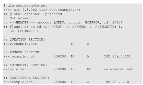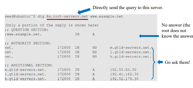 – 위의 예에서 우리는 루트 서버가 답변을 알지 못하기 때문에 답변 섹션이 없음을 알 수 있지만 추가 섹션(A 레코드)에 IP 주소와 함께 권한 있는 네임서버(NS 레코드)에 대해 알려줍니다.